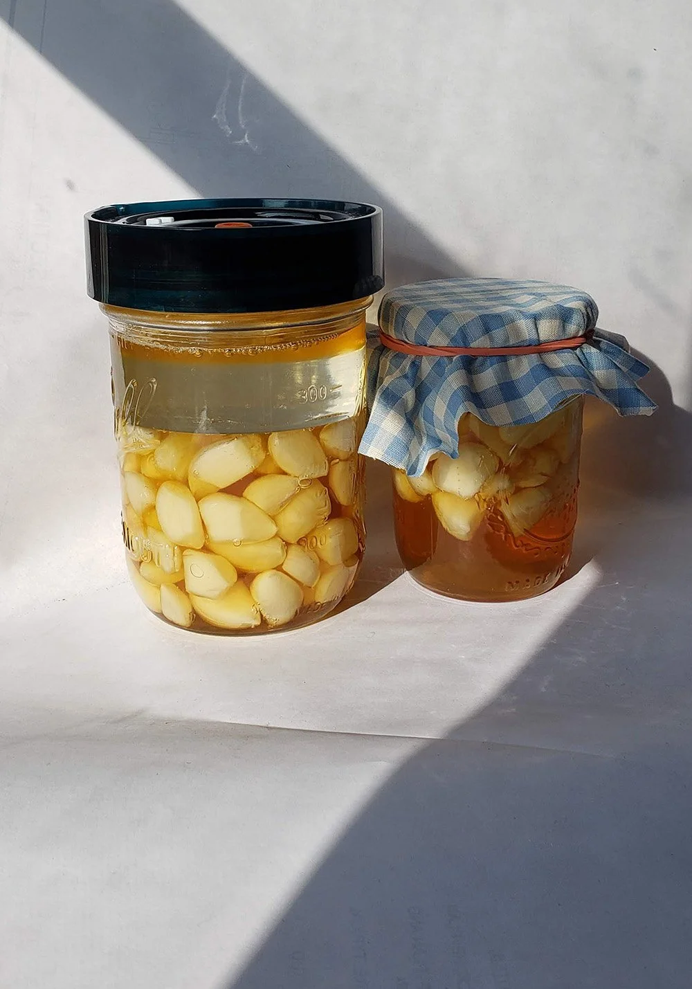 I also made lacto fermented garlic and experimented with making honey fermented garlic. For one jar of honey garlic I used an airlock from @nourishedessentials an I left the other open but with a fabric covering to see how the two batches might differ. Interestingly the only difference I have noticed is that the open ferment seemed to ferment a little bit faster than the one with an airlock. Either way the result is tasty and great for cooking or by itself.